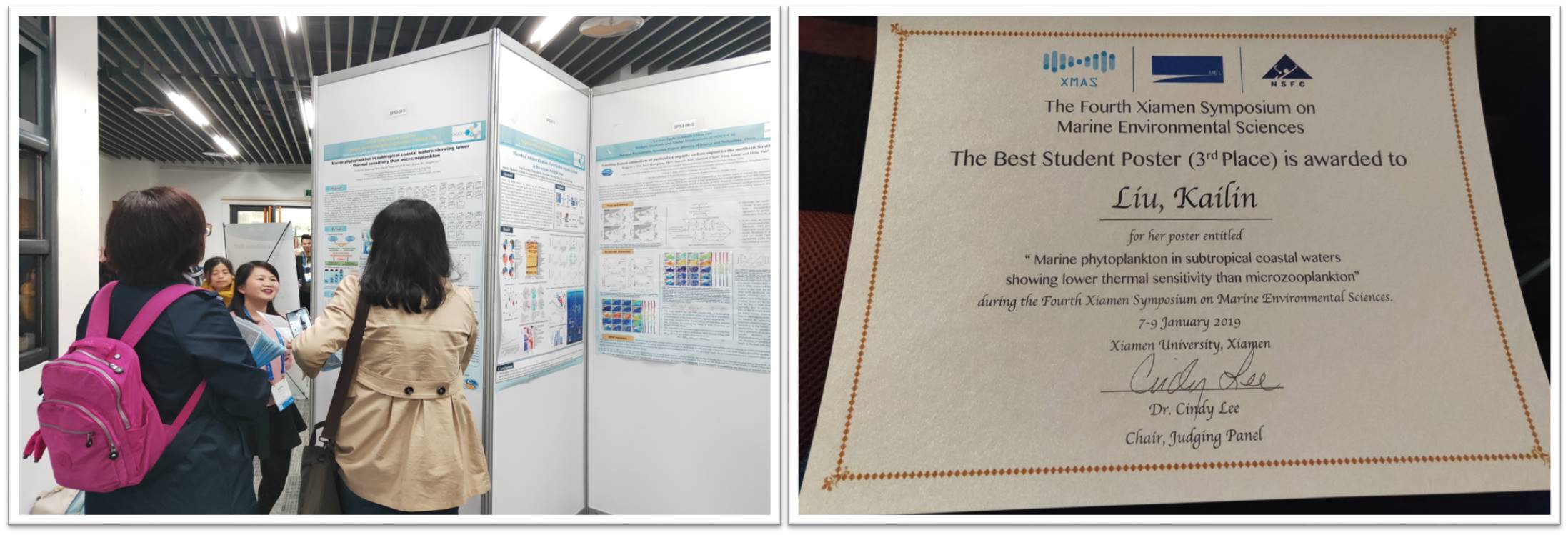 项目第三课题的博士生刘凯琳做了墙报展示——“Marine phytoplankton in subtropical coastal waters showing lower thermal sensitivity than microzooplankton”,并获得大会优秀墙报奖。