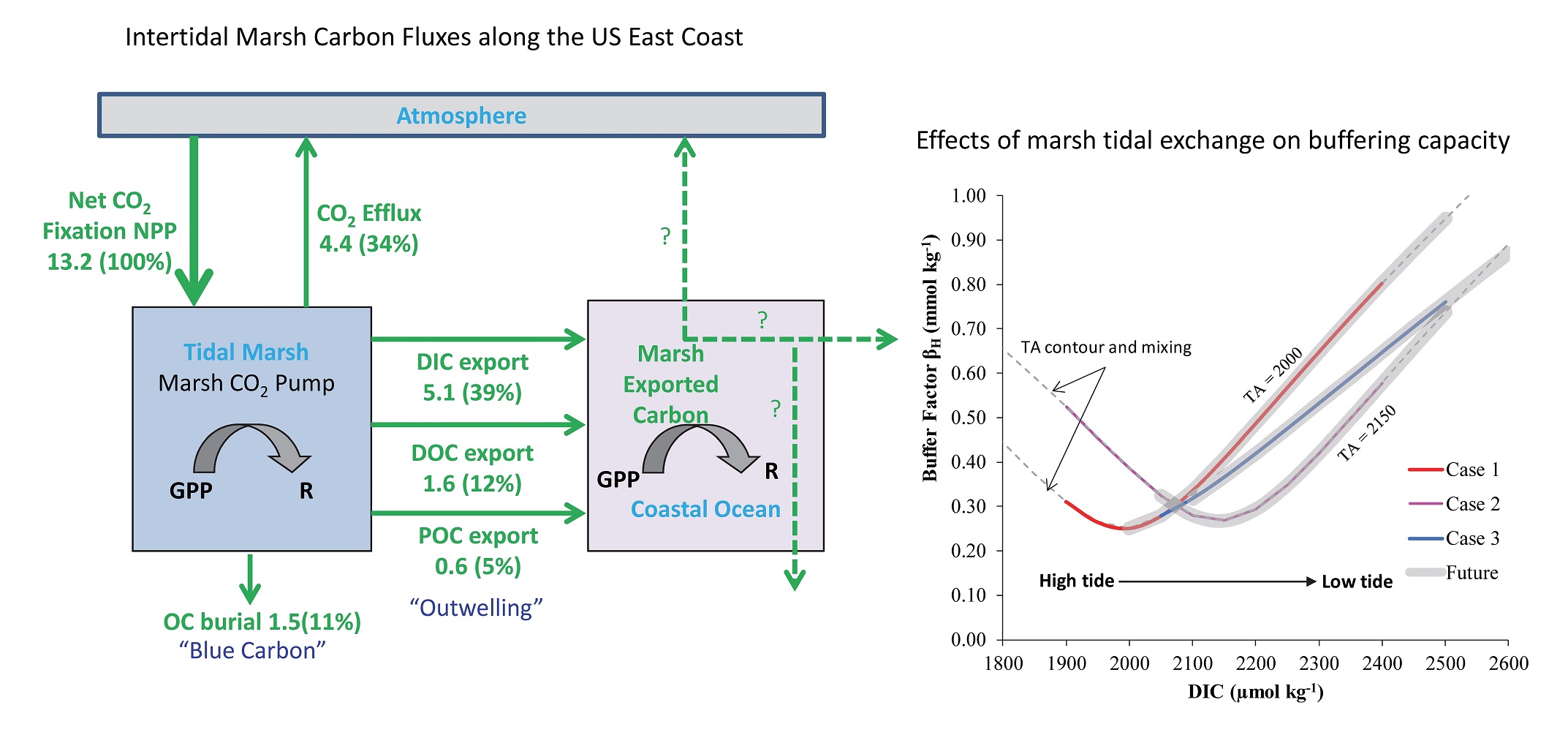from http://www.us-ocb.org/ Marsh exports of DIC and alkalinity may have complex implications for a future, more acidified ocean. A recent study by Wang et al. (2016) published in Limnology & Oceanography combines tidal water sampling of CO2 parameters across seasons and continuous in situ measurements of biogeochemically relevant parameters and water fluxes with high-resolution modeling in an intertidal salt marsh of the U.S. northeast region. Marsh DIC export is more than two times previous estimates, and exhibits high variability over tidal and seasonal cycles, which is modulated by both marsh DIC generation and by water fluxes. It is a major term in the marsh carbon budget and translates to one of the largest carbon fluxes along the U.S. East Coast.